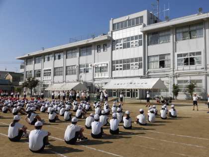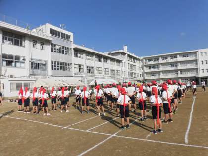1年生から6年生がそろって運動会の全体練習です。全学年が運動場に集まり開会式を行うのは4年ぶりとなるので、流れや動きを一つひとつ確認しながら進めています。