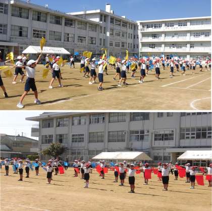 3年生と4年生合同での運動会にむけた集団演技の練習のようすです。動きが大きくなるとともに、ずいぶんとそろってきました。