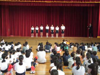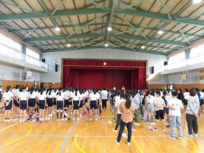 10月の児童集会を行いました。集会の中で、選挙啓発ポスターコンクール・国際平和ポスターコンテストで入選・受賞した児童を紹介し、みんなから大きな拍手を送りました。集会の最後には、みんなで今月の歌「勇気100%」を歌いました。