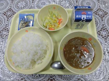 今日の給食メニューは、カレーシチュー・洋風野菜炒め・ミニフィッシュ・ごはん・牛乳です。「洋風野菜炒め」は、キャベツ・にんじん・ホールコーンを、塩・こしょうで炒め、最後にオリーブ油で香りづけをして作っています。