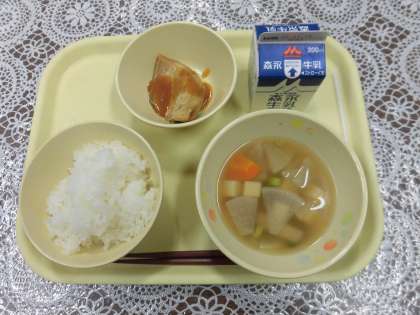 今日の給食メニューは、のっぺい汁・さばのみそ煮・ごはん・牛乳です。「のっぺい汁」は、里芋でねばりを出していて、そのねばりが餅のようであることから、「濃餅」と書いて「のっぺい」と呼んでいるそうです。給食の「のっぺい汁」は、昆布と削り節で出汁をとって、鶏肉・豆腐・里芋・大根・にんじん・青ねぎの具材を入れ、片栗粉でとろみをつけて作っています。