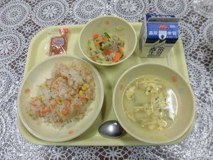 今日の給食メニューは、たまごスープ・ツナコーンライス・しゃぶしゃぶ風サラダ・ごまドレッシング・牛乳です。「しゃぶしゃぶ風サラダ」は、豚肉をしゃぶしゃぶ風に仕上げ、キャベツ・にんじん・ピーマンを炒めて作ったサラダに、ごまドレッシングをかけて食べる、栄養たっぷりのサラダです。