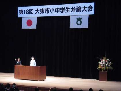 サーティホールの大ホールにおいて『大東市小中学生弁論大会』が行われました。住道北小学校からは、5年生1分間スピーチの部に平野 更紗さんが学校代表として、6年生弁論の部に小田 カエラさんが本選出場者として発表しました。