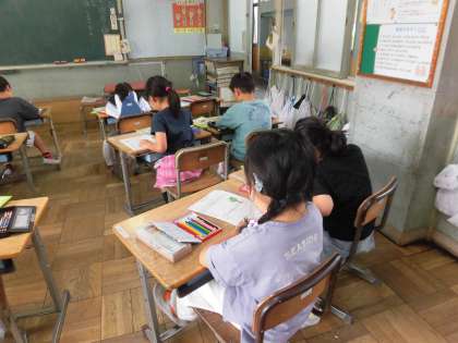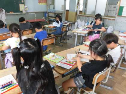 2年生が、昨日の遠足のことをふり返りながら、遊具で遊んだことや、蝶を追いかけたこと、お弁当のことなどを絵日記に書いています。