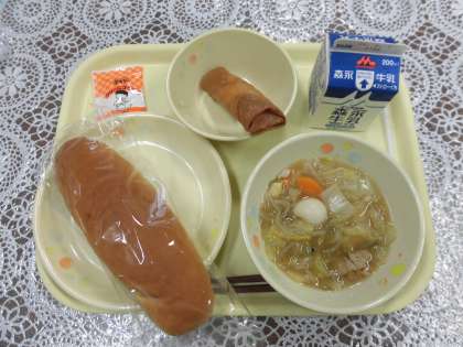 今日の給食メニューは、鶏肉の中華炒め・はるまき・コッペパン・ミルクバター・牛乳です。鶏肉の中華炒めは、鶏肉と、白菜・にんじん・玉ねぎ・たけのこ・干ししいたけ・もやしなどの野菜を油で炒め味付けをして、うずら卵を加え、かたくり粉でとろみをつけてごま油を入れて仕上げています。いろいろな野菜やお肉がたっぷり入っていて、栄養バランスの良い献立です。