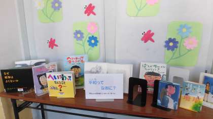 図書室前のコーナーには、6年生の修学旅行・平和学習に合わせ、「平和」をテーマとした本がならんでいます。