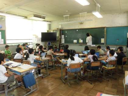 3年生の算数の学習です。繰り上がりのあるかけ算のひっ算について、計算の順序を確認しながら学んでいます。