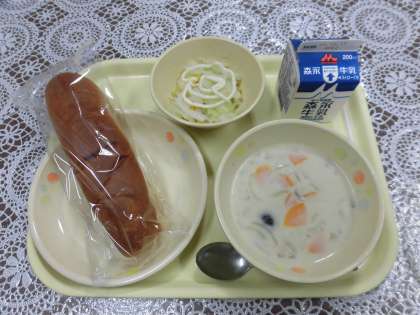 今日の給食メニューは、鮭のクリーム煮・キャベツとコーンのサラダ・黒糖パン・牛乳です。「鮭のクリーム煮」は、鮭と野菜をホワイトルウで煮込んでいます。ホワイトルウは、小麦粉・バターを炒めて、牛乳を入れて作り、とろみをつけています。