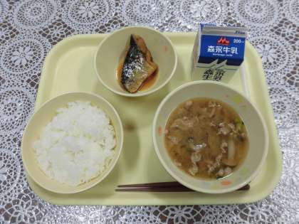 今日の給食メニューは、秋のみそ汁・さばの煮つけ・ごはん・牛乳です。「秋のみそ汁」には豚肉のほかに、さつまいも・えのきだけ・しめじ・まいたけなど、秋が感じられる具材が入っています。「食欲の秋」にしっかりと栄養をとりましょう。