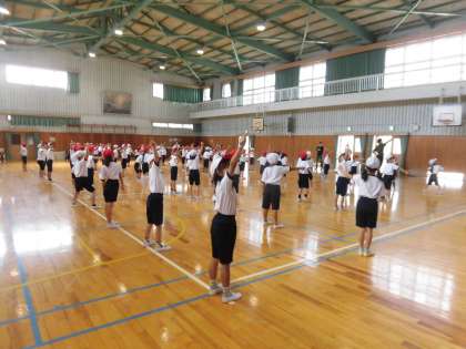 1年生・2年生合同での団体演技の練習です。音楽に合わせて動きをしっかりと覚えながら、楽しくダンスに取り組んでいます。