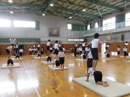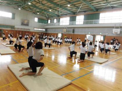 5年生・6年生合同での団体演技の練習です。ひとつひとつの技のポイントなどを、ペアでふり返りながら取り組んでいます。