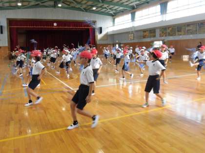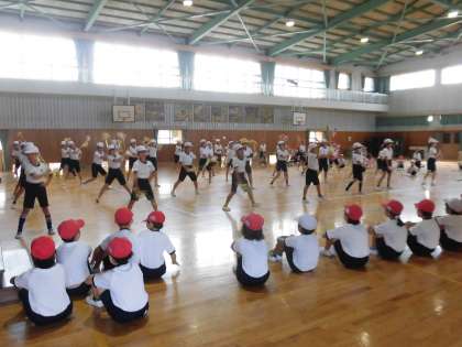 3年生・4年生合同での団体演技の練習です。学年ごとに交互に見合って、感想などを交流しながら互いに高め合っています。