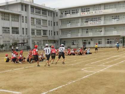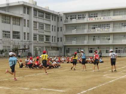 6年生がリレーの練習をしています。できるだけスピードを落とさずに、スムーズなバトンパスができるように練習しています。
