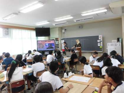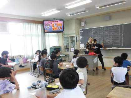 6年生の外国語の学習です。AET(Assistant English Teacher)の先生の発音をしっかりと聞きながら、ハロウィンにちなんだクイズを通して楽しく学んでいます。