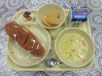 今日の給食メニューは、コーンクリームスープ・コッペパン・チキンナゲット・プチゼリー・牛乳です。今日の給食の「コーンクリームスープ」には、粒のままのホールコーンと、コーンをクリーム状にしたスイートコーンの2種類のコーンを使っています。日本ではコーンは野菜のように食べていますが、メキシコなどの国では、ごはんやパンの代わりとして食べられているそうです。