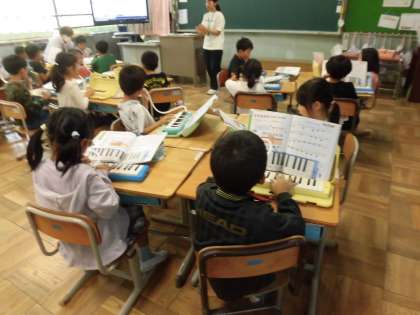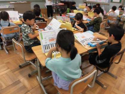 1年生の音楽の学習です。けんばんハーモニカの指づかいを一生けん命に練習しています。