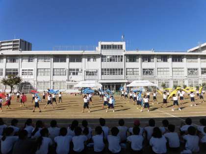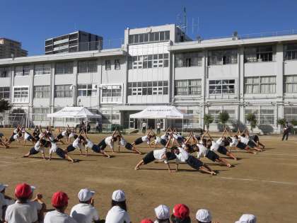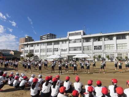運動会を明日に控え、今日は全学年が互いに演技を見合いました。運動会当日は保護者観覧席を正面に演技をするので、児童席からは横や後ろから見ることになるので、今日は真正面から見て、互いに大きな拍手を送り合いました。