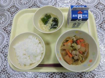 今日の給食メニューは、厚揚げと鶏肉のみそ煮・ごはん・わかたまスープ・牛乳です。「厚揚げと鶏肉のみそ煮」は、厚揚げと鶏肉を、にんじん・たまねぎ・キャベツ・ピーマンなどの野菜といっしょにみそ味で煮た、栄養たっぷりのこんだてです。
