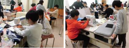 5年生の家庭科の学習です。慣れないミシンの扱いに苦労しながらも、仲間と助け合いながらエプロンづくりに取り組んでいます。仕上げのアイロンがけもていねいにしています。