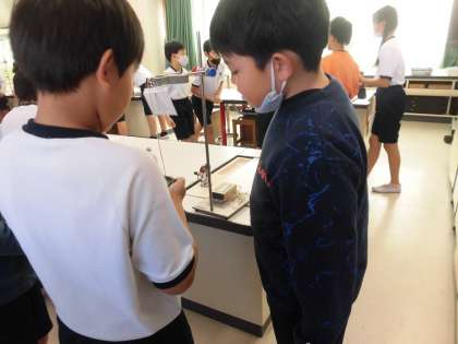 5年生の理科の学習です。「ふりこのきまり」の単元で、ふりこの重さによってふりこが1往復する時間が変わるかについて、まずは予想を立て、どうしてそのように予想するのかという理由を交流した後、実際に実験をして確かめています。