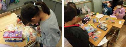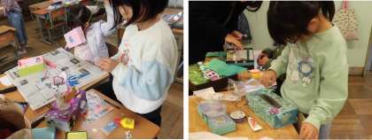 1年生が図工の学習で、校内図工展にむけた作品づくりに取り組んでいます。それぞれに工夫した形や飾りつけを考えています。