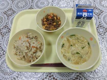 今日の給食メニューは、かやくごはん・かきたま汁・五目豆・牛乳です。五目豆は、大豆をやわらかく煮て、牛肉・こんにゃく・にんじん・三度豆を入れて甘辛い味付けです。牛肉が入っているので、食べやすいです。