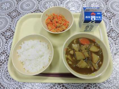 今日の給食メニューは、米粉カレーうどん・ごはん・にんじんしりしり・牛乳です。「にんじんしりしり」は沖縄県の郷土料理で、「しりしり」とは沖縄県の方言で「せん切り」の意味とのことです。