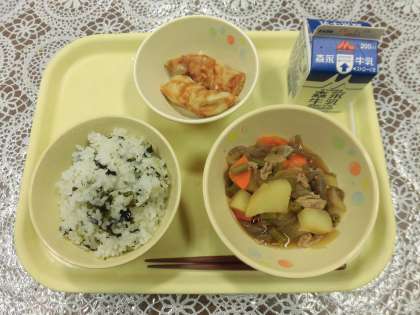 今日の給食メニューは、豚じゃが・青菜わかめごはん・ちくわの天ぷら・牛乳です。今日の給食は、豚肉を使った肉じゃがです。関西では、肉じゃがには牛肉を使うことが多いですが、関東では、豚肉を使うことが多いそうです。