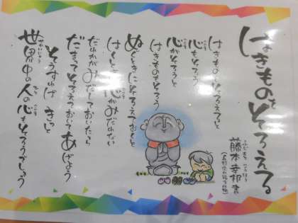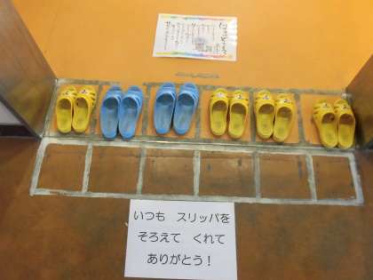 「はきものをそろえると 心もそろう 心がそろうと はきものもそろう」 トイレ入口のスリッパがきれいにそろっています。