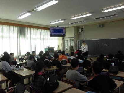 5年生の外国語の学習です。AET(Assistant English Teacher)の先生の発音をしっかりと聞きながら、クイズを通して楽しく学んでいます。