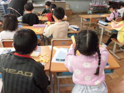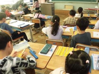 「100の数は、10が10こ集まった数」であることについて、さんすうブロックをならべて確かめながら学習しています。