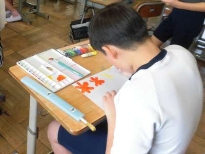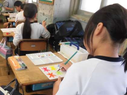 3年生の図工の学習です。水彩絵の具をつかって、筆づかいや色づかいを練習しています。