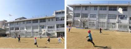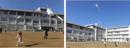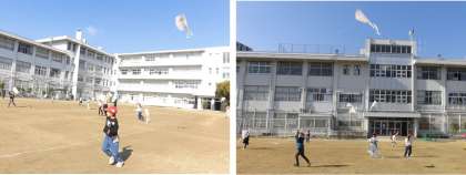 1年生が自分で作った凧あげにチャレンジしました。今日は風がほとんどなく、凧あげにはむずかしい中でしたが、一生けん命に走り回りながら凧あげを楽しんでいました。