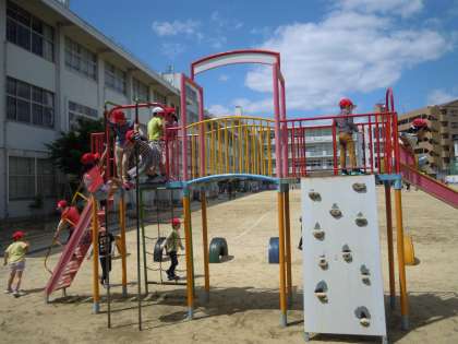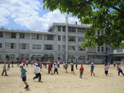 連休明けのさわやかな青空のもと、給食後、休み時間の運動場にはたくさんの子どもたちの歓声がひびいています。