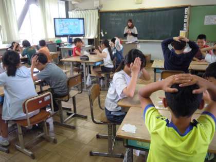 4年生の外国語の学習です。AET(Assistant English Teacher)の先生の発音をしっかりと聞き取りながら、カード取りゲームをして楽しく学んでいます。