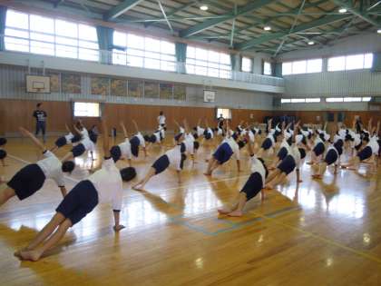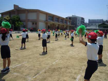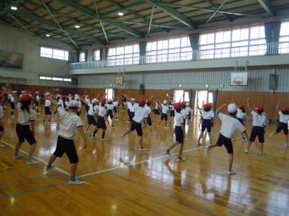 運動会にむけた各学年の練習がすすんでいます。上の写真から順に、1・2年生、3・4年生、5.6年生のようすです。少しずつ動きをおぼえています。