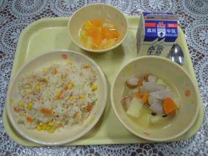 今日の給食メニューは、ポトフ・ツナコーンライス・フルーツカクテル・牛乳です。「フルーツカクテル」には、みかん・パイン・桃のフルーツと、レモンのゼリーが入っていて、今日のような気温の高い日にぴったりのさわやかなデザートです。