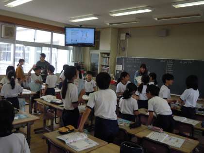5年生の外国語の学習です。AET(Assistant English Teacher)の先生の発音を参考にして、「What do you like 〜?」と互いに質問し合っています。