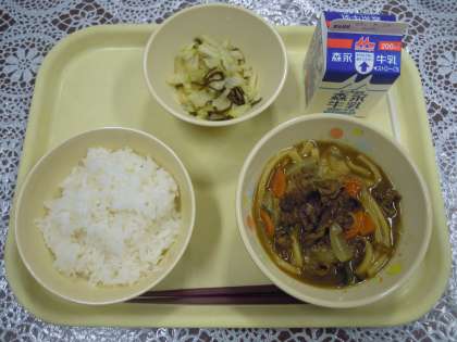 今日の給食メニューは、米粉カレーうどん・ごはん・キャベツと塩昆布炒め・牛乳です。米粉カレーうどんは、肉や野菜などの具も多く、コクがある程よい辛さでとてもおいしかったです。