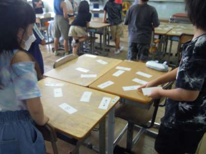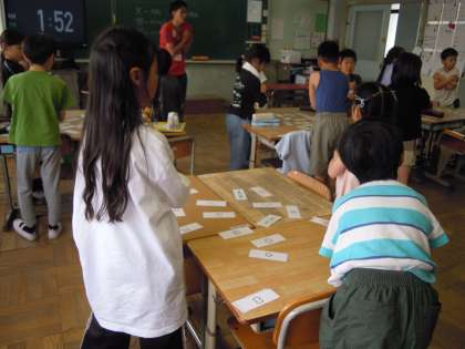 3年生の社会科の学習です。地図記号カードを使ったゲームをしながら、楽しく地図記号を覚えています。