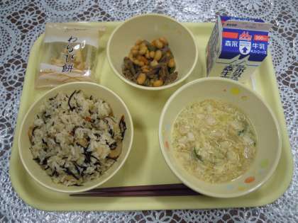 今日の給食メニューは、ひじきごはん・かきたま汁・五目豆・わらびもち・牛乳です。ひじきには、鉄分とカルシウムが多く含まれていて、体をつくるために必要な栄養素が多く、体に良いことがたくさんある食品です。また、わらびもちは、初夏を感じさせるメニューです。