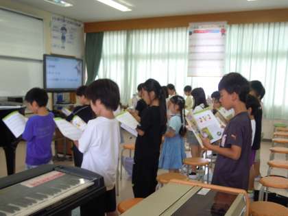 「夏も近づく、八十八夜 〜 」、音楽室から3年生が歌う「茶つみ」のきれいな歌声が聞こえています。