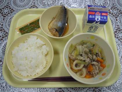 今日の給食メニューは、きりたんぽ風・鯖の煮つけ・ごはん・のり・牛乳です。「きりたんぽ」は、秋田県の郷土料理のひとつで、ご飯をつぶしたものを木の棒にちくわのように巻きつけて焼き、棒からはずして切ったものを山菜やキノコを入れて煮込んだ料理です。給食では、きりたんぽに見えるちくわを使って、きりたんぽ風にしています。