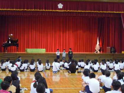 月に一度、全校児童が体育館に集まって行う児童集会です。児童会役員から運動会の目標「勝っても 負けても 全力で楽しもう!」の確認、そして集会の最後にはみんなで今月の歌、「きみと ぼくの あいだに」を歌いました。