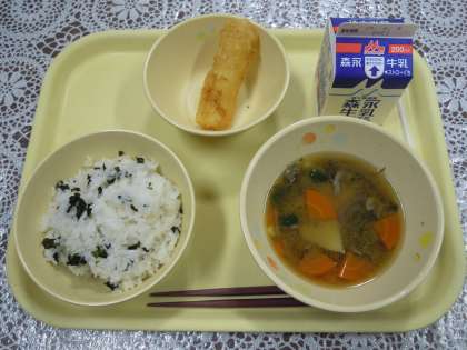 今日の給食メニューは、わかめごはん・豚汁・いかの天ぷら・牛乳です。豚汁には、豚肉、じゃがいも、ごぼう、にんじん、こんにゃく、青ネギなど、たくさんの具材が入っています。