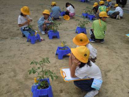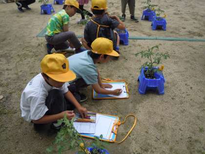 2年生の生活科の学習です。大きく育ってきたミニトマトの観察、葉の形などを細かく見て記録しています。