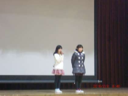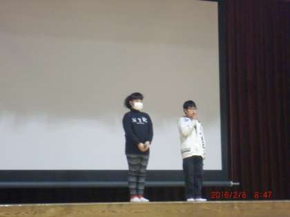 給食感謝集会の後、児童会より、ユニセフ募金の報告があり、その後、6年生の児童会メンバーより、住北小の良いところを書いてもらうアンケートについてのお願いがありました。その後、3年生のリコーダー演奏を聴きながら気持ちよく退場しました。