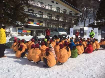 大山ホワイトリゾートに予定より早く到着しました。全員元気!早速スキーウェアに着替えて入村式。宿舎の方から140cmの雪ですよ、上に上がると日本海が見えますよ、とお話を伺いました♪