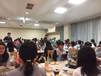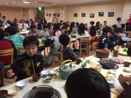 夕食はすき焼きです。みんな、お腹ぺっこぺこ今日はよく運動しました。実行委員さんと「いっただき♪ま〜す。」