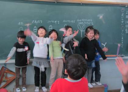 さっそく、みんなで紙トンボを飛ばしてみました。